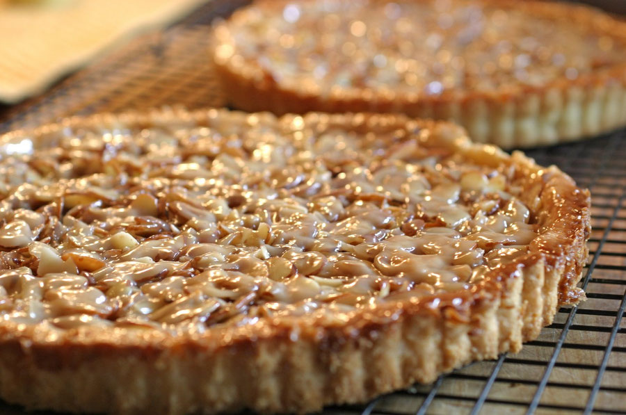 Line floor of oven with aluminum foil and bake tart on center rack at 350 degrees 20 to 30 minutes. Filling will bubble up and may overflow, then settle and begin to caramelize. Rotate tart frequently during last 15 minutes of baking so top is even deep golden brown. Remove tart to cake rack and let cool to room temperature before cutting.