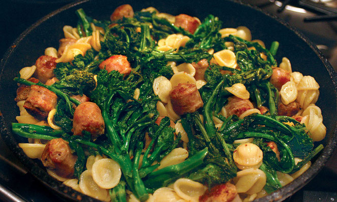 One of my favorite Italian dishes. Orecchiette, (or-i-cheti)"little ears" in Italian, are small disc-like or ear shaped semolina pastas once made only in Italian homes. If you can't find this
